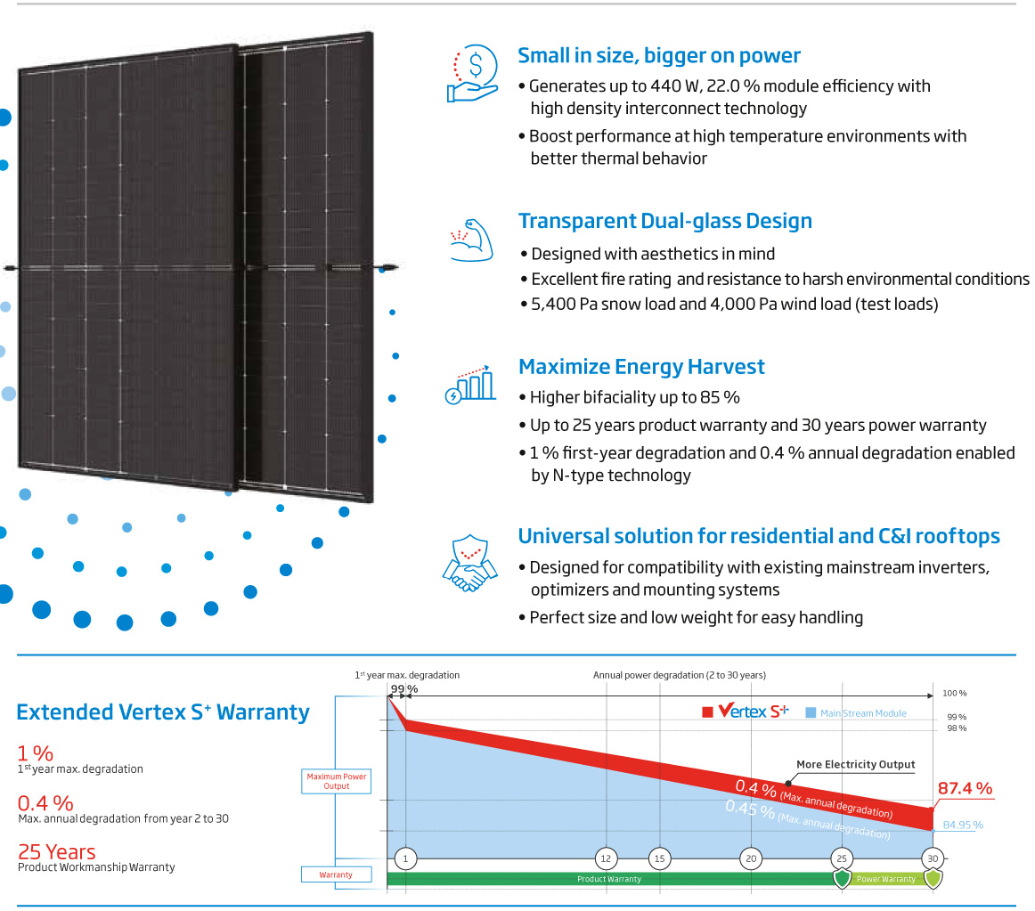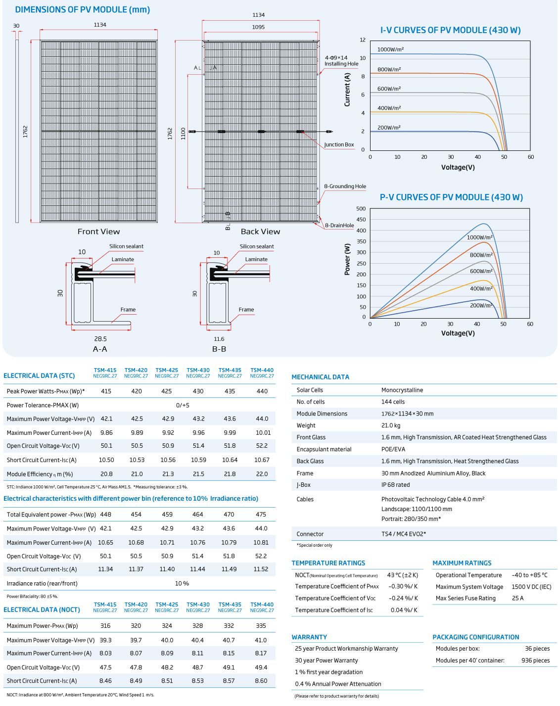 Φωτοβολταϊκό Πάνελ N-type Bifazial Dual Glass Trina NEG9RC.27, 435Wp, Παλέτα/36τεμ.